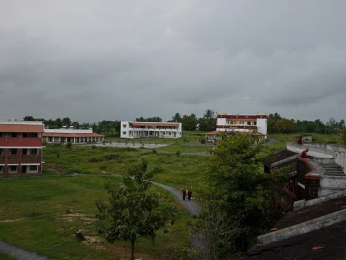 View from atop southern monks' rooms. Monks are reciting their memorization.